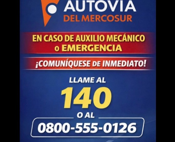 Autovía del Mercosur recuerda a los usuarios que, ante cualquier situación de auxilio mecánico o emergencia en el corredor vial concesionado, se encuentran habilitados los siguientes canales de comunicación: