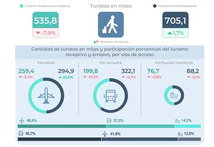 Como resultado de estos movimientos, en diciembre se registró un saldo negativo de 389.900 visitantes internacionales, explicado por un déficit de 169.300 turistas y 220.600 excursionistas. Durante ese mes, los visitantes no residentes realizaron 939.600 viajes, mientras que los residentes concretaron 1.277.700 viajes.