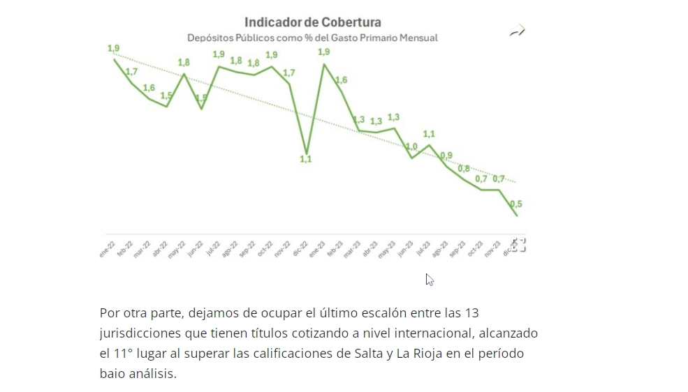 Sin profundizar en el análisis de la caída precedente, podemos identificar un comportamiento simétrico entre nuestra calificación en el ranking jurisdiccional y la compresión de los niveles de liquidez o cobertura provincial, los cuales evidencian una utilización poco responsable de los saldos acumulados, probablemente asociado a la necesidad de “mostrar gestión” para revalidar la elección popular.