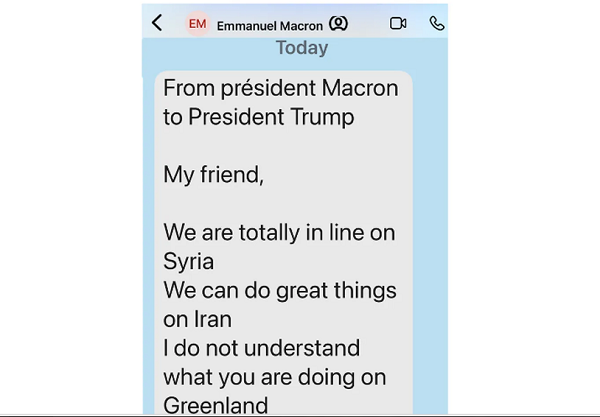 “Del presidente Macron al presidente Trump. Mi amigo, estamos totalmente alineados con Siria. Podemos hacer grandes cosas en Irán. No entiendo que estás haciendo en Groenlandia”, habría expresado el mandatario francés.