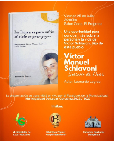 En un acto realizado el lunes 8 de abril de 2024 en la Iglesia Catedral de Paraná, durante la misa de acción de gracias por los 25 años de ordenación episcopal del arzobispo Juan Alberto Puiggari, se presentó el libro “La Tierra es para sufrir; el cielo es para gozar. Biografía de Víctor Manuel Schiavoni, siervo de Dios”, escrito por Leonardo Legrás. Esta obra recopila la vida de Víctor, un joven de Lucas González fallecido a los 17 años el 7 de septiembre de 1995 a causa de leucemia, y quien ha sido declarado “siervo de Dios” por la Iglesia Católica, iniciando así su proceso de beatificación y posible canonización.