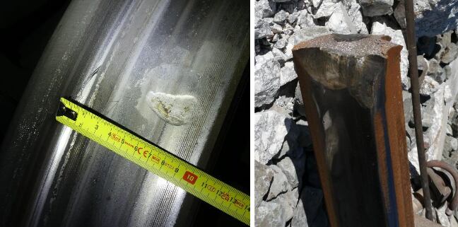 El patrón uniforme de las muescas en los coches 2, 3 y 4 es compatible con un impacto contra la cabeza del carril. La comparación visual entre las muescas de las ruedas y la sección del carril roto en la zona cero del descarrilamiento mostró resultados “presumiblemente coincidentes”. Según la CIAF, la deformación del carril y las marcas en las ruedas indican que el carril estaba fracturado. La continuidad del carril estaba interrumpida, por lo que la parte anterior a la rotura soportó inicialmente el peso total de la rueda, provocando que descendiera levemente. Al no actuar solidariamente la parte posterior a la fractura, se produjo momentáneamente un escalón entre ambos lados, que golpeó la llanta de la rueda.